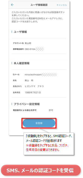 氏名、携帯電話番号、メールアドレスなど、登録に必要なユーザー情報をご入力いただき、SMS、メールによる認証コードによる認証を行えば、Money Tapへのサインアップは完了です。